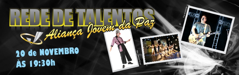 É com imenso prazer e honra que Aliança Jovem da Paz – IBP, promove mais uma rede de talentos. A palavra de Deus diz em Rm 11:29 que os dons e a vocação de são irrevogáveis e também a palavra de Deus nos ordena em Sl 150:6 que todo ser que respira louve ao Senhor. O nossos talentos são para louvar e expressar a grandeza de Deus através de nossas vidas e estamos diante de uma oportunidade tremenda de despertar / avivar as virtudes que o Senhor nos concedeu. A palavra de Deus também nos diz em Ap. 21:7-8 que os tímidos não herdarão o reino de Deus e a palavra de Deus continue nos dizendo em I jo 4:18 que o verdadeiro amor lança fora todo medo. Esse é o tempo de abandonarmos a timidez, o medo e entrarmos no novo tempo de Deus, pois já fomos atingidos pelo verdadeiro amor libertador do Senhor Jesus Cristo. Então você líder, discípulo de avivamento que é ousado, valente e que entendeu o propósito por obediência e entendimento, sejam bem-vindos a REDE DE TALENTOS.